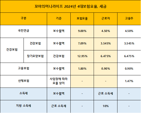 2024년에는 장기요양보험률이 12.81%에서 12.95%로 약간 상승했고, 나머지 국민연금 9%, 건강보험 7.09%, 고용보험 1.8%는 변동이 없었습니다.